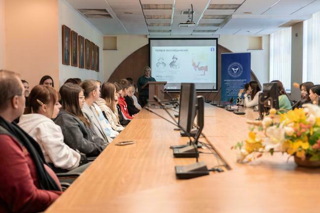 Галина Плотникова совершила вместе со слушателями экскурс в прошлое, сфокусировав внимание на драматических событиях 2014-2022 годов. Участники лекции проследили тернистый путь, пройденный новыми регионами к воссоединению с Россией. Особое внимание будущих юристов спикер обратила на правовую чистоту и соответствие принимаемых решений законодательству РФ: