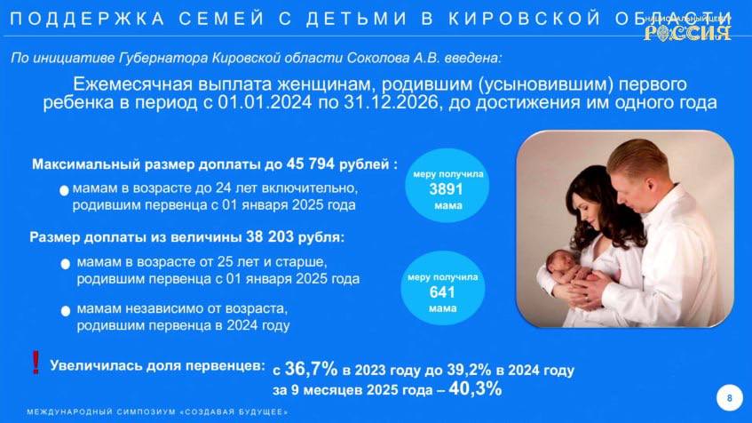 В секции «Демографическое будущее от вызовов к решениям» Курдюмов рассказал о мерах поддержки семей с детьми, реализуемых в Кировской области. Особое внимание он уделил введенной два года назад «зарплате мамам», которую сейчас получают более 4,5 тысяч женщин. Эта мера уже показала свою эффективность — в регионе увеличилось рождение первых детей в семьях.
