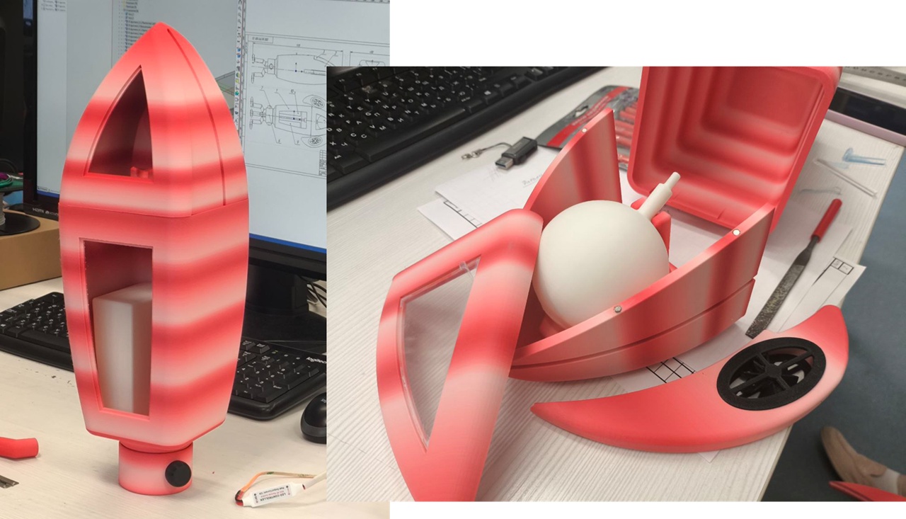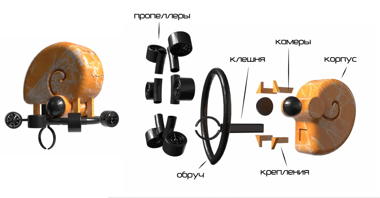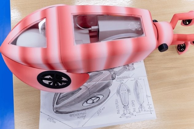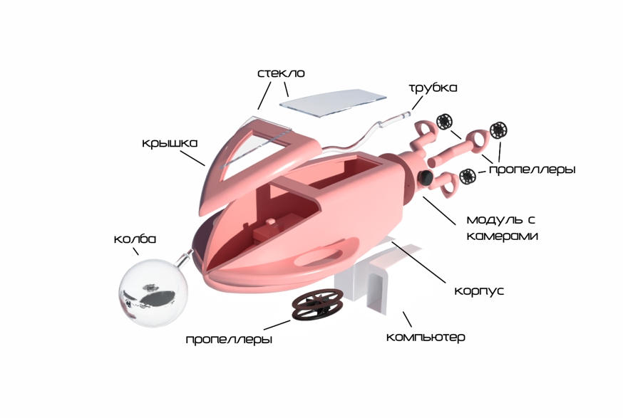 Так, в рамках домашнего задания ребята представили проект подводного беспилотного аппарата «Кальмариз» в форме кальмара, способного обнаруживать загрязнение воды нефтью. Данная разработка имеет обтекаемый корпус, поворотный модуль и подвижные щупальца-лопасти. В конструкции также предусмотрены внутренняя подсветка, поворотный блок с камерами и съёмная крышка с колбой, имитирующей систему забора и анализа проб воды.
