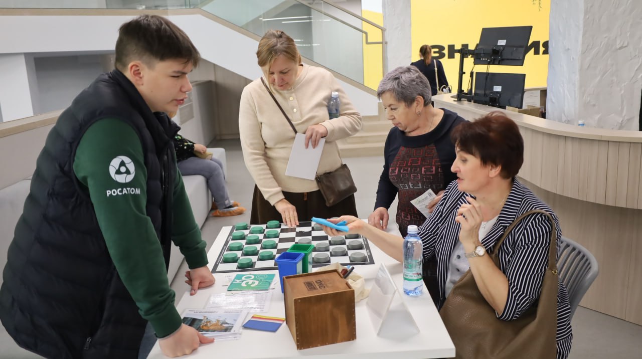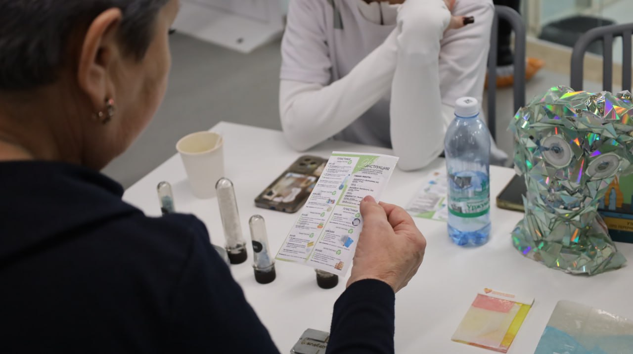 На площадке Экоцентра гостей ждали «зелёные» активности: интерактив о переработке, велошредер, где можно было самому измельчить пластиковые крышечки, и викторина от волонтёров движения «Экосистема». Даже шашки для игры были сделаны из переработанных материалов.