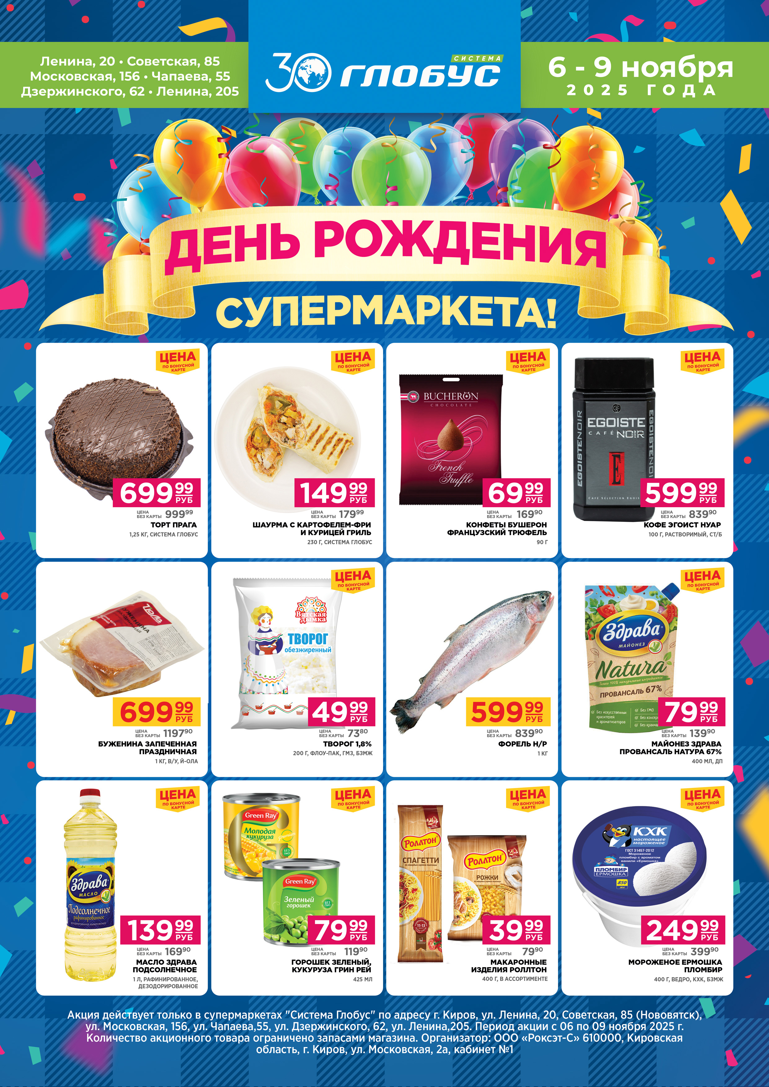 С 6 по 9 ноября 2025 года в честь праздника в супермаркетах по адресам: Ленина, 20, Советская, 85 (Нововятск), Московская, 156, Чапаева, 55, Дзержинского, 62 и Ленина, 205 действуют специальные предложения:
