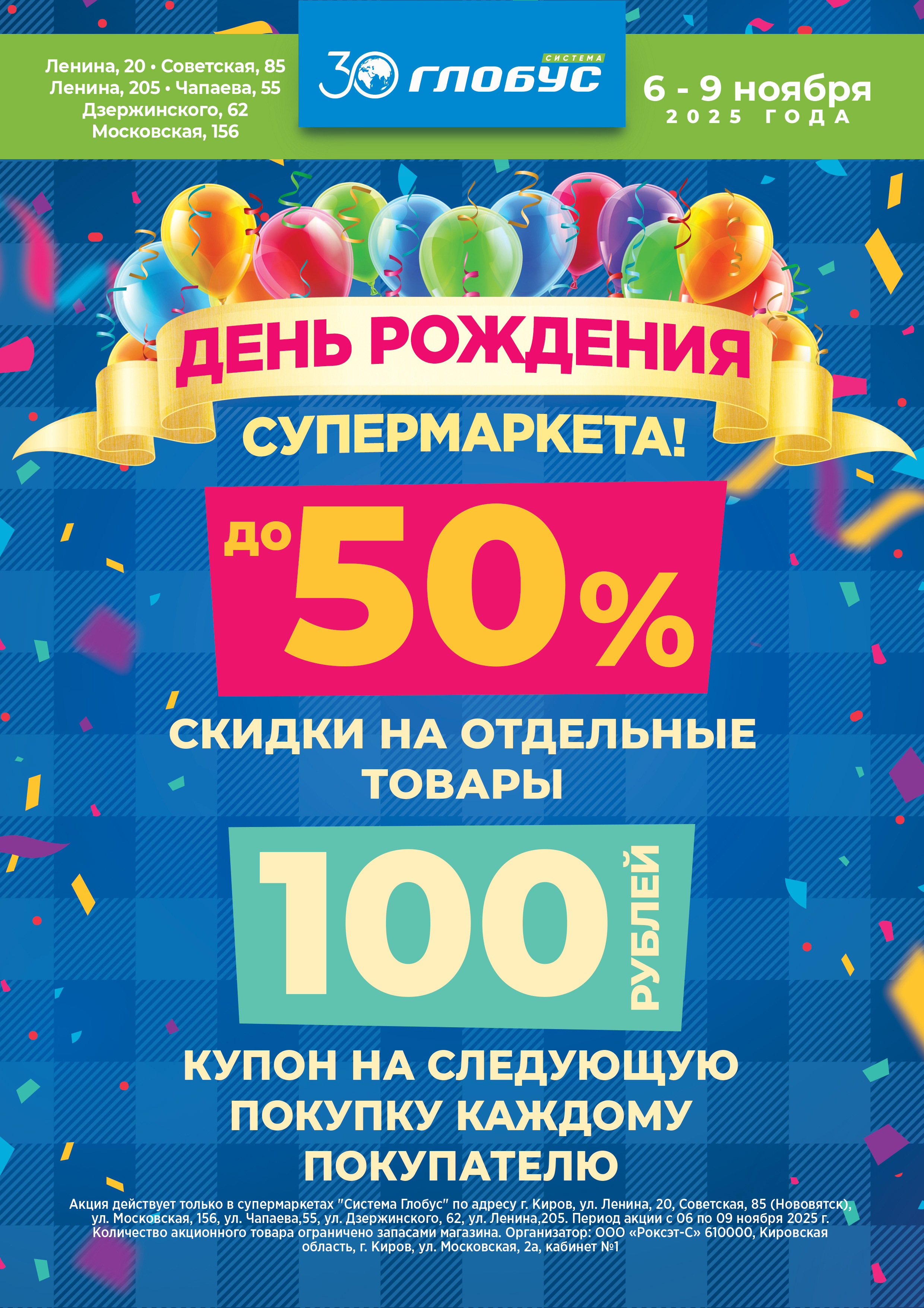 Отмечайте Дни рождения супермаркетов «Система Глобус», совершайте выгодные покупки и получайте подарки!