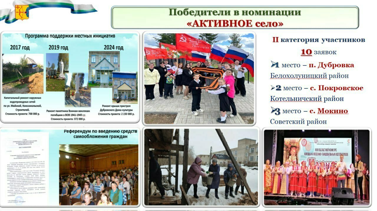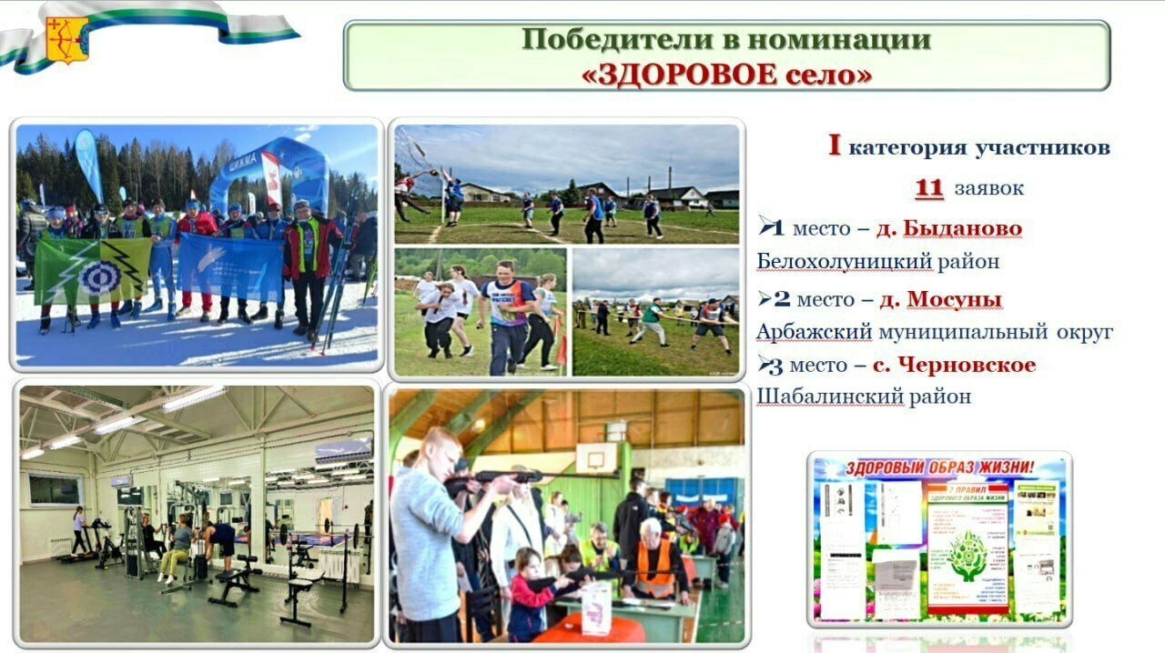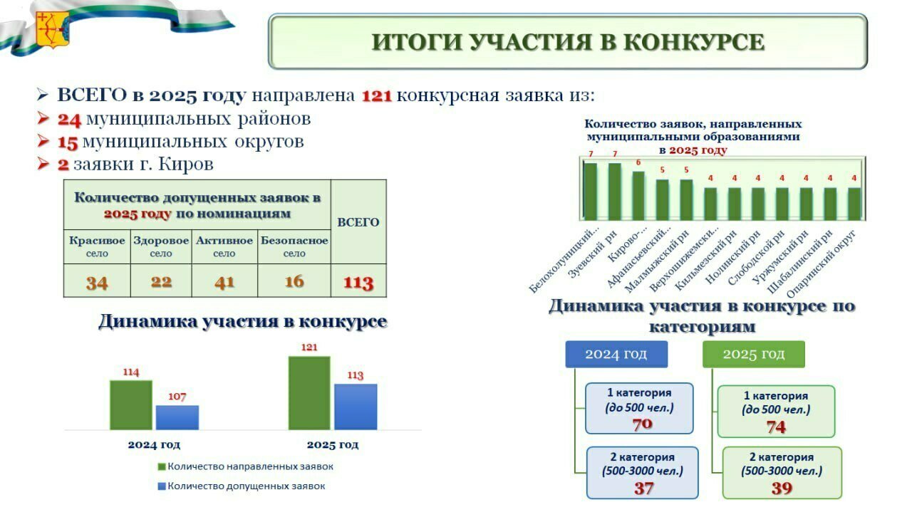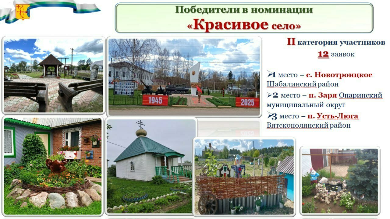Как сообщил министр внутренней политики региона Денис Иконников, конкурс проводился в двух категориях: для населенных пунктов с численностью жителей до 500 человек и от 500 до 3000 человек. Наиболее активными стали Белохолуницкий, Зуевский и Кирово-Чепецкий районы.