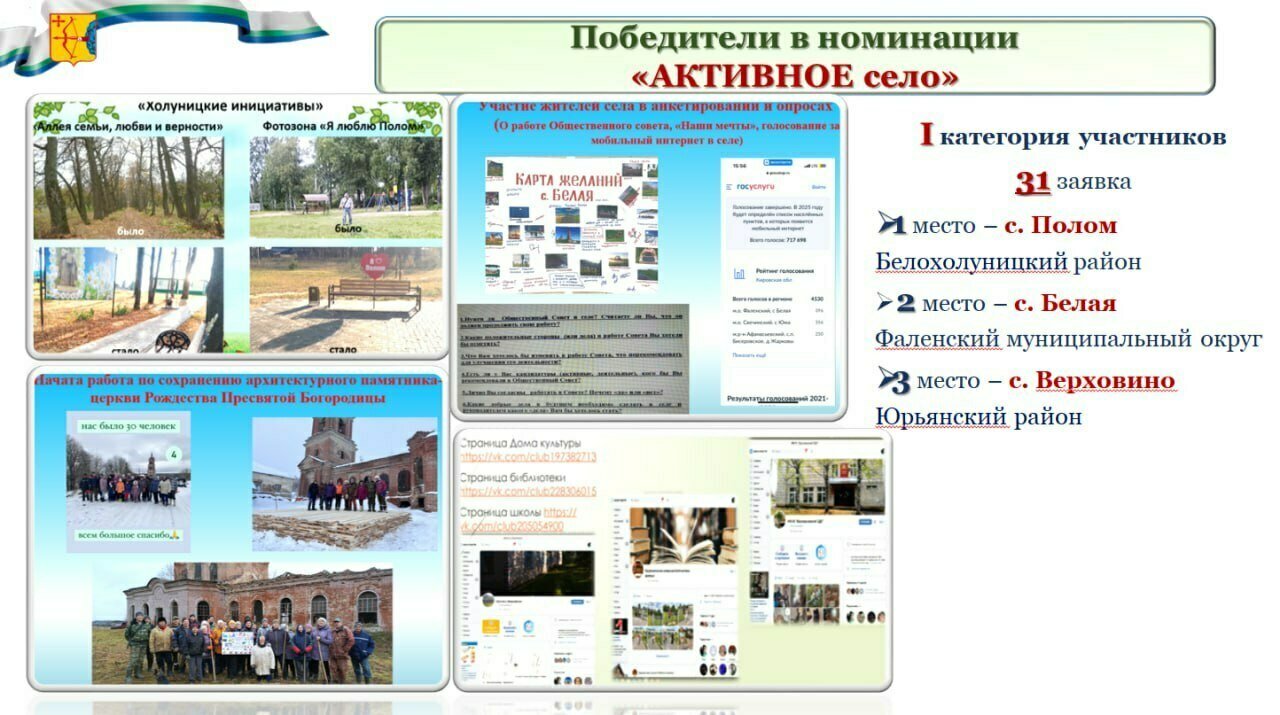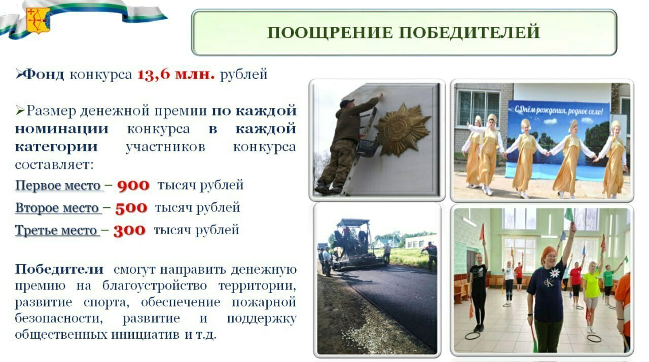 Победители определялись в нескольких номинациях, среди которых «Красивое село», «Здоровое село», «Активное село» и «Безопасное село». Денежные поощрения составят 900, 500 и 300 тысяч рублей за первое, второе и третье места соответственно.