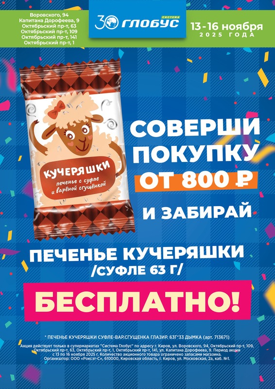 Организатор акции ООО «Роксэт-С», 610000, г. Киров, ул. Московская, д. 2а, кабинет 1, ОГРН 1024301315500. Подробности на s-globus.ru или по тел.: (8332)711-700.