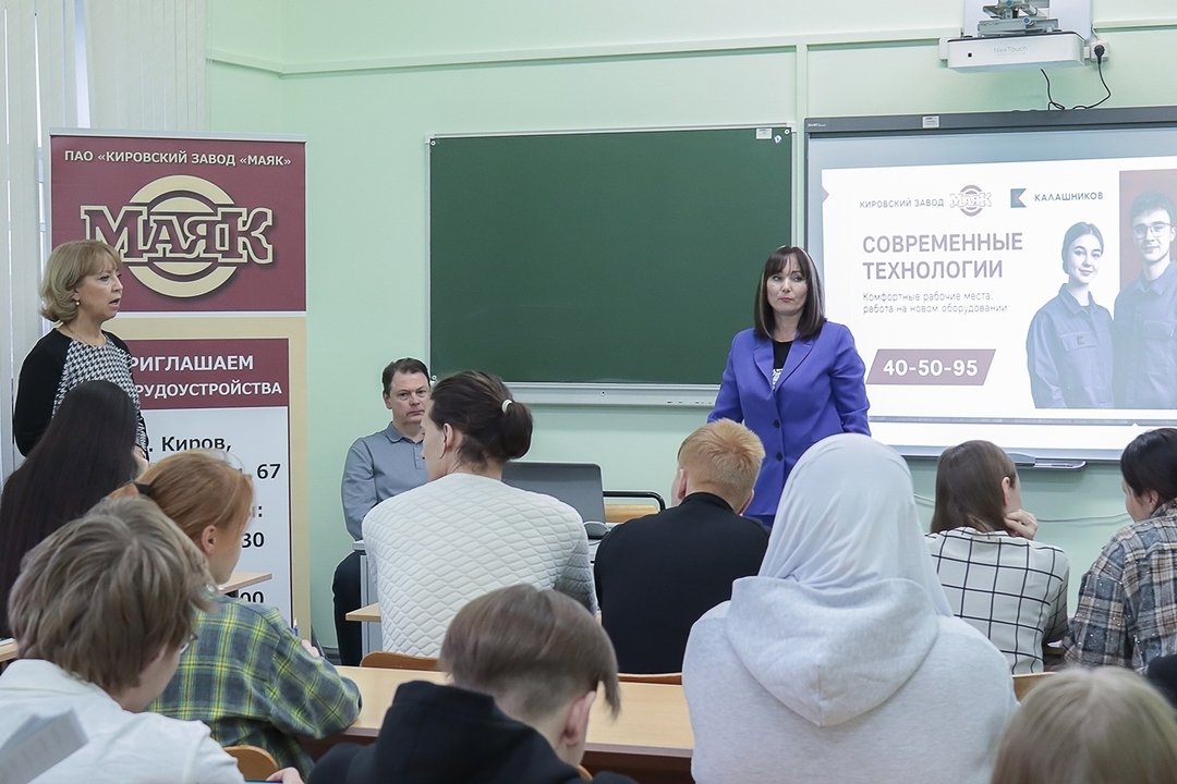 Заместитель начальника отдела управления персоналом «Маяка» Евгений Ермолин познакомил ребят с историей завода, планами его развития и перспективами, отметив, что социальная поддержка работников находится на высоком уровне, который превосходит аналогичные программы на других предприятиях Кировской области. В частности, завод помогает молодым сотрудникам в оплате жилья, ипотеки, выплачивает подъемные средства от 50 до 200 тысяч рублей. Ермолин подчеркнул, что в текущем году «Маяк» получил много современного оборудования, однако главное условие эффективной эксплуатации любых станков, аппаратуры – наличие компетентных специалистов.