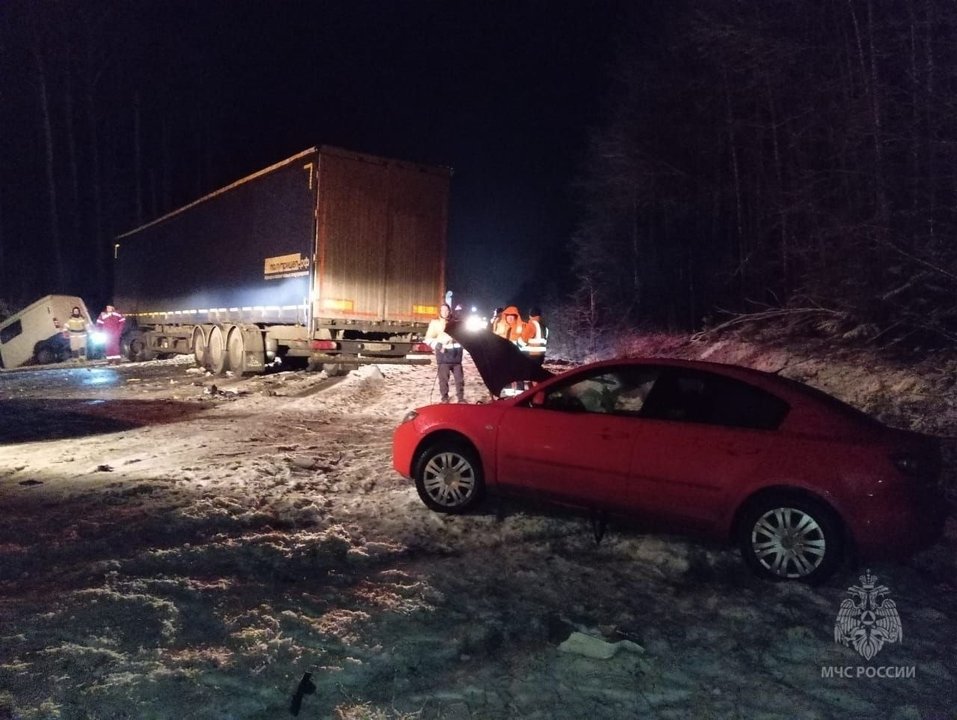Сегодня вечером в Юрьянском районе на трассе «Вятка» столкнулись три автомобиля: «Соболь», «Мазда» и грузовик «Фотон».