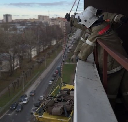 Кроме того, пожарные отрабатывали приемы спасения пострадавших, применяя систему наклонного троллея — специальный метод эвакуации людей с больших высот с помощью верёвочных конструкций.