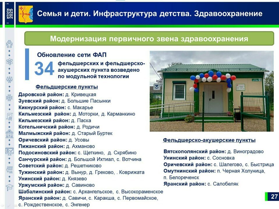 Также в этом году завершена программа по обновлению фельдшерско-акушерских пунктов в сельской местности — установлены все 34 запланированные модульные конструкции. Ещё одним шагом к доступности помощи стало открытие с 1 июля филиала хирургического отделения Больницы скорой медицинской помощи в Котельниче.