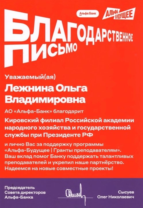 Альфа-Банк выразил благодарность Ольге Владимировне за поддержку программы «Альфа-Будущее | Гранты преподавателям».