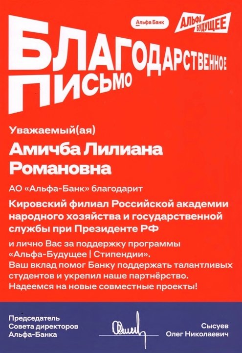 - Благодарность за программу «Альфа-Будущее | Стипендии».