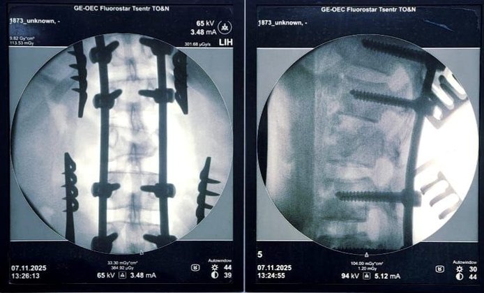 Была проведена операция – спинной мозг высвобожден из сдавления, восстановлены конфигурация сломанного позвонка и ось позвоночника, проведена стабилизация позвоночного столба металлоимплантами. Она длилась более двух часов.