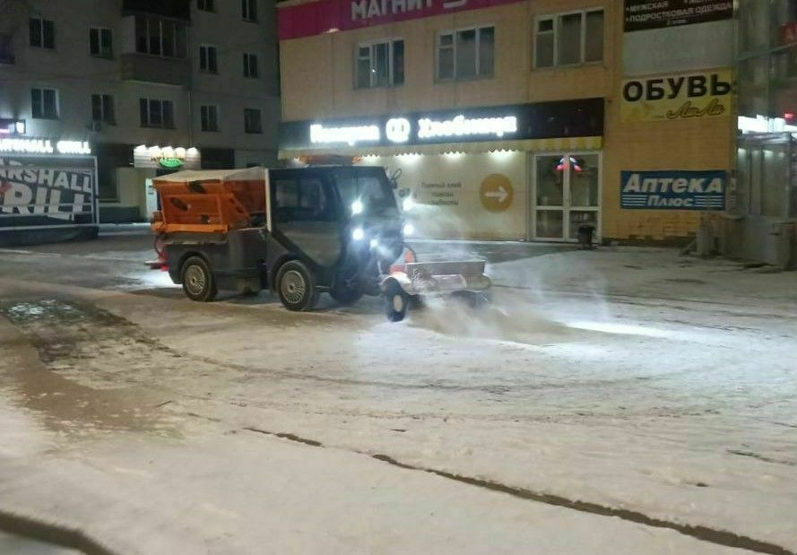 Ночью на городских дорогах работало 52 единицы спецтехники и 76 рабочих. Днём численность задействованных ресурсов увеличилась в полтора раза.