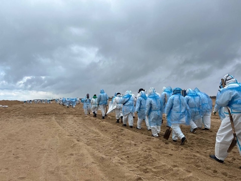 Оставшиеся 3-4 дня мы работали в станице Благовещенская – примерно в 100 км от Анапы. Там ситуация оказалась ещё серьёзнее: километровый пляж был перерыт канавами, засыпанными песком, чтобы мазут не распространялся дальше. Мы просеивали песок через специальные сита, собирали мазут в мешки, а затем трактор вывозил их с берега.