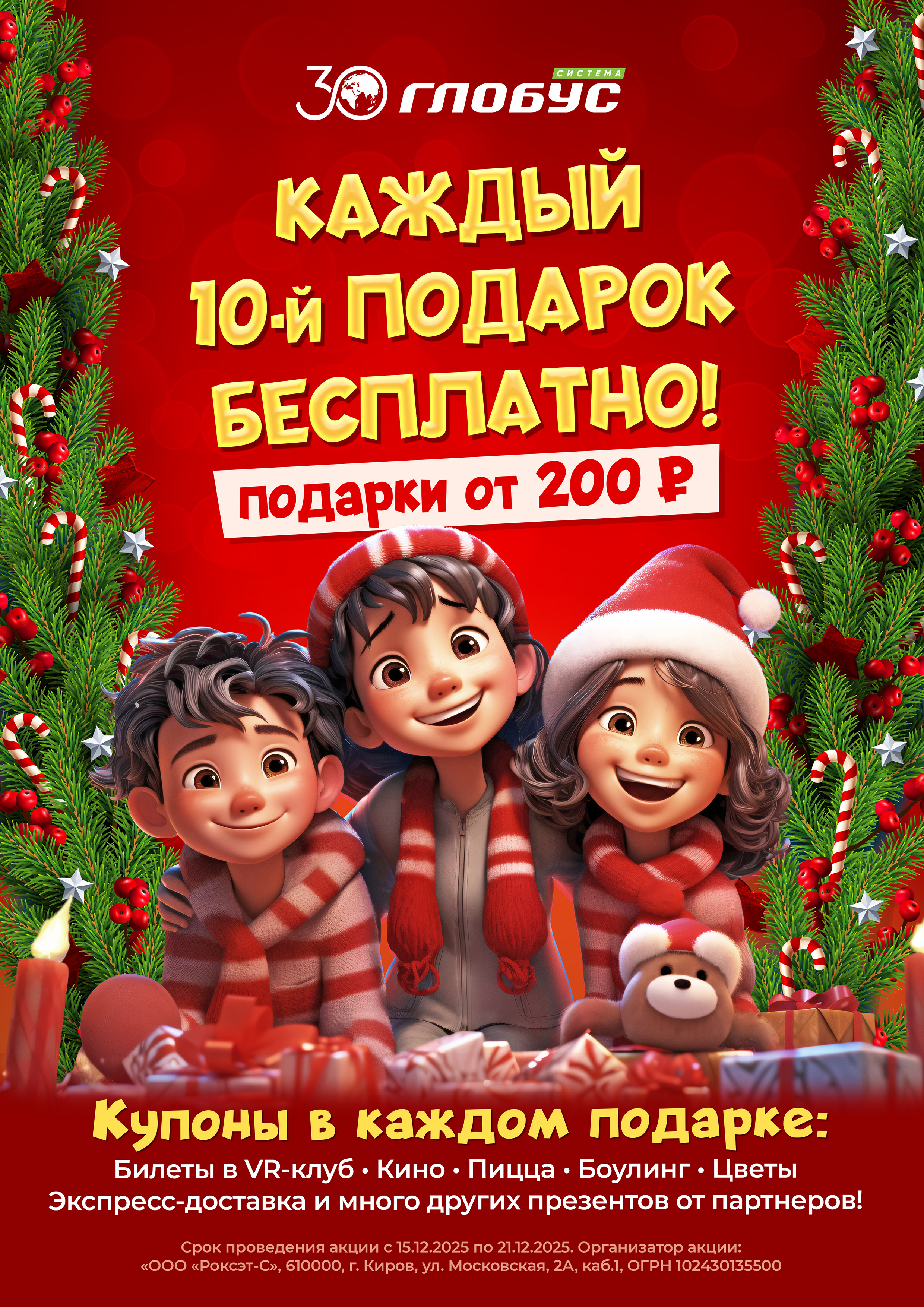 А еще, даже в самом маленьком сладком новогоднем подарке вы найдете сюрприз от компании «Система Глобус». Это 9 купонов для всей семьи: билет в кино, купон на игру в боулинг, сюрприз от клуба виртуальной реальности Portal VR, купон на вкуснейшую пиццу, на продукцию кулинарии «Глобус» и на бесплатную доставку продуктов и цветов.