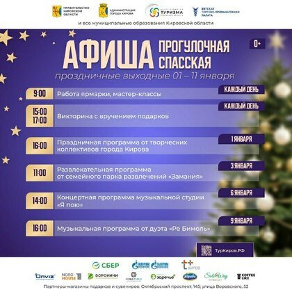 Откроет программу 1 января большая праздничная концертная программа от коллективов Кирова, которая начнется в 16:00 и продлится до 19:00. 3 января с 11:00 до 14:00 на Спасской пройдет специальная детская программа от парка развлечений «Замания». В преддверии Рождества, 6 января в 14:00, на площадке перед Центром туризма выступит музыкальная студия «Я пою». Завершит праздничную неделю 9 января в 16:00 концерт дуэта «Ре Бимоль».