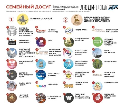 В лонг-лист было предложено 99 кандидатов. В итоговый список редакция включила места, которые получили высокие оценки как в экспертном, так и в народном голосовании. В таблице представлены сводные результаты с процентными показателями.