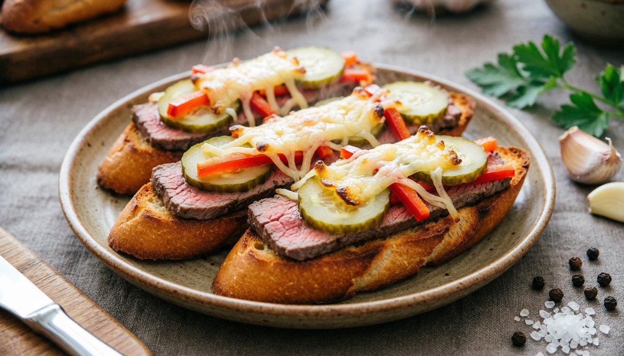 Эта горячая закуска сбалансирована: у неё есть и сытное мясо, и хрустящий хлеб, и пикантные овощи. А фирменный соус от «Здравы» придаст ей тот самый яркий, запоминающийся вкус.