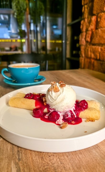 - Блины с вишнёвым компоте и сливочным мороженым