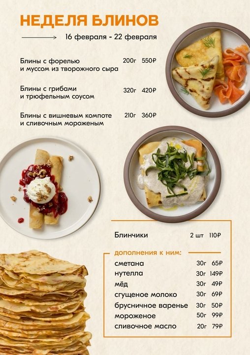 А если хочется классики — берите блинчики и добавляйте к ним сметану, мёд, нутеллу, сгущённое молоко, брусничное варенье, мороженое или сливочное масло — соберите свой идеальный вкус ![]()