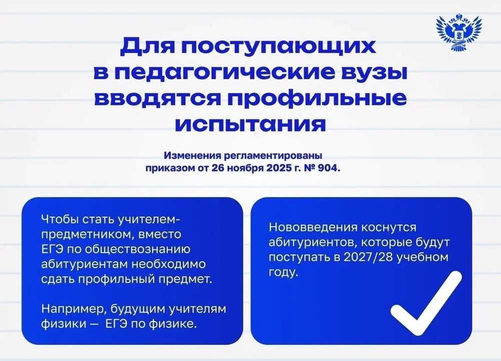 Согласно ему при поступлении в 2027/28 учебном году на педагогические направления по профилям «Математика», «Физика/Астрономия», «Информатика», «Химия», «Биология», «Русский язык», «Литература» больше не будет приниматься ЕГЭ по обществознанию в качестве обязательного вступительного испытания. Вместо него абитуриентам необходимо сдать профильный предмет.