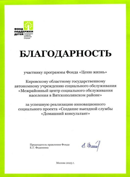 Летом 2024 года межрайонный комплексный центр социального обслуживания населения в Вятскополянском районе стал победителем федерального грантового конкурса Фонда поддержки детей, находящихся в трудной жизненной ситуации, с проектом «Домашний консультант».