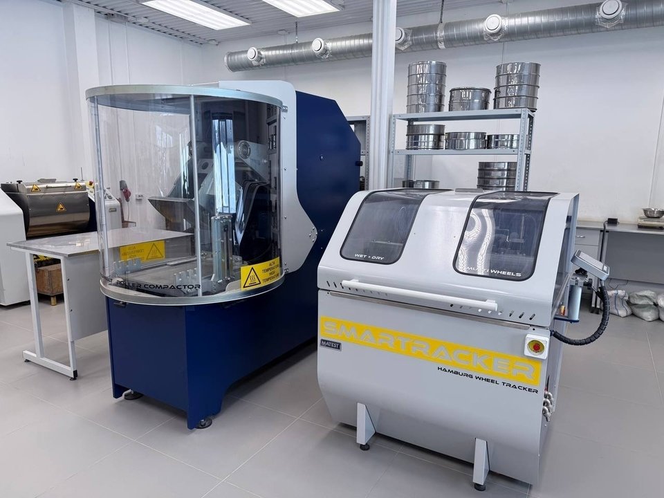 Также в начале 2025 года введён в эксплуатацию комплекс для определения стойкости к колееобразованию. Он включает вальцовый уплотнитель для изготовления плит‑образцов и прибор с двумя нагруженными колёсами для параллельных испытаний. Каждое колесо выполняет 10000 циклов нагружения (или 20000 прокаток по плите), а глубина колеи фиксируется автоматически – это существенно повышает достоверность данных.