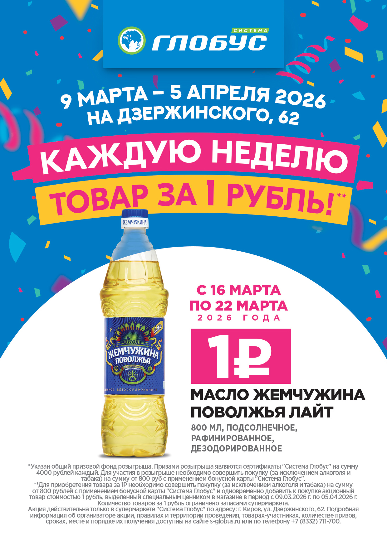 Организатор акции - ООО «Роксэт-С», ОГРН 1024301315500 ИНН 4345024144, 610000 Кировская область, г. Киров, ул. Московская, д.2А, кабинет №1. Сроки проведения с 06.03.2026 по 05.04.2026г.Розыгрыш призов состоится 07.04.2026г. года в прямом эфире в группе https://vk.com/sglobus. Подробная информация об акции, сроках, месте ее проведения и количестве призов на сайте s-globus.ru или по тел.: (8332) 711-700.