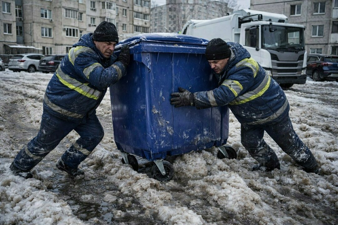 Погода сейчас нестабильная: температура держится около нуля, днём снег подтаивает, ночью снова подмораживает. В таких условиях заезды на контейнерные площадки существенно осложняются. Тяжёлая техника буксует, машины проседают в рыхлый снег.