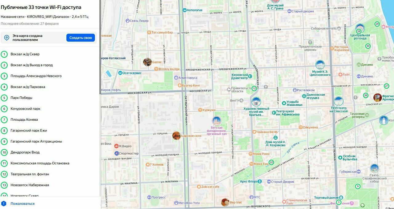 Узнать о местоположении точек Wi-Fi можно с помощью поисково-информационной системы «Яндекс Карты» по ссылке (12+). Чтобы получить доступ к интернету, пользователям надо выбрать сеть с названием KIROVREG_WIFI и зарегистрироваться на платформе оператора по звонку на номер 8 800 или через портал «Госуслуги».
