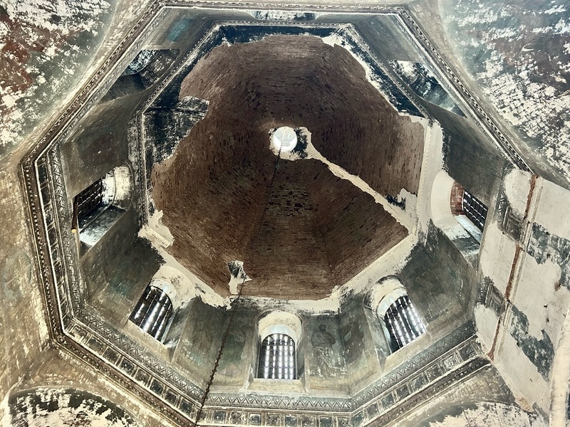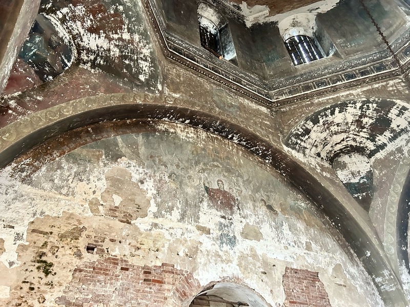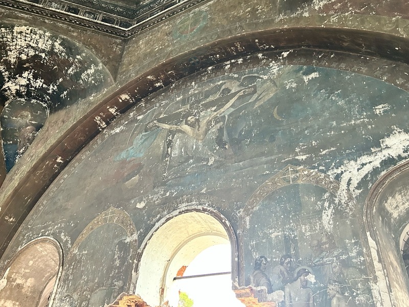 Обогнув храм, мы зашли в холодную часть, где раньше располагался главный алтарь. Пространство высокое, гулкое. На стенах уцелели фрагменты фресок с ликом Иисуса Христа.