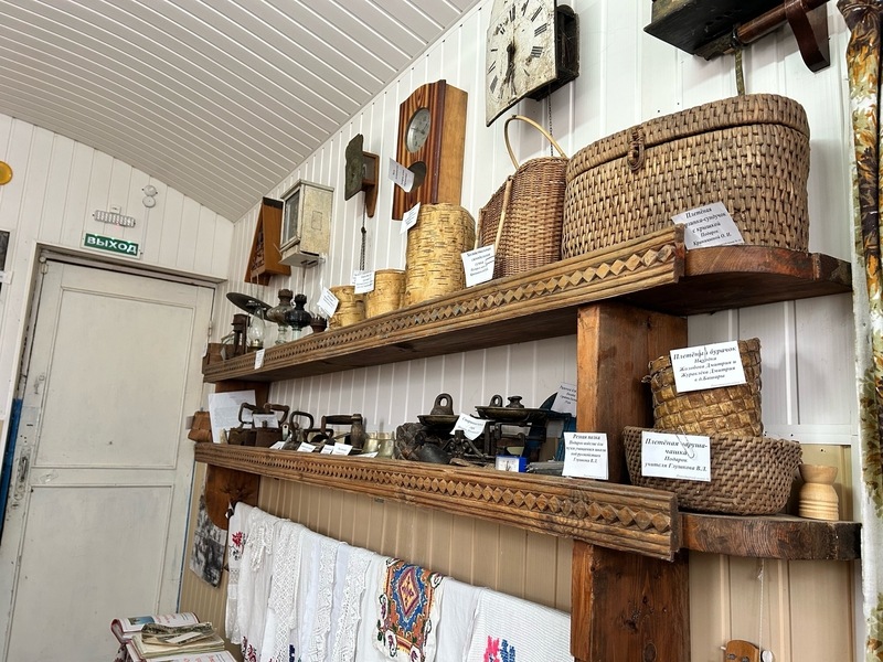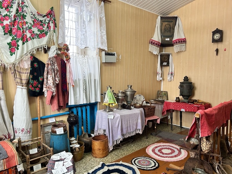 Помещение музея небольшое. Всего две комнаты, но чувствуется, с какой любовью и трепетом всё здесь собрано. Первая посвящена землякам-воинам. На стенах - портреты участников Великой Отечественной, Чеченской, Афганской войн и СВО. Про каждого подвижница рассказывает краткую историю. Удивительно! На стенах больше сотни портретов, но она помнит судьбу каждого. Вторая комната - реконструкция крестьянской избы: самовары, ткацкие станки, старинная одежда, сундуки, корзины, утюги... А на скамье лежат папки с историей села, которые Галина Германовна собирала вместе со школьниками. В том числе - материалы о церкви.