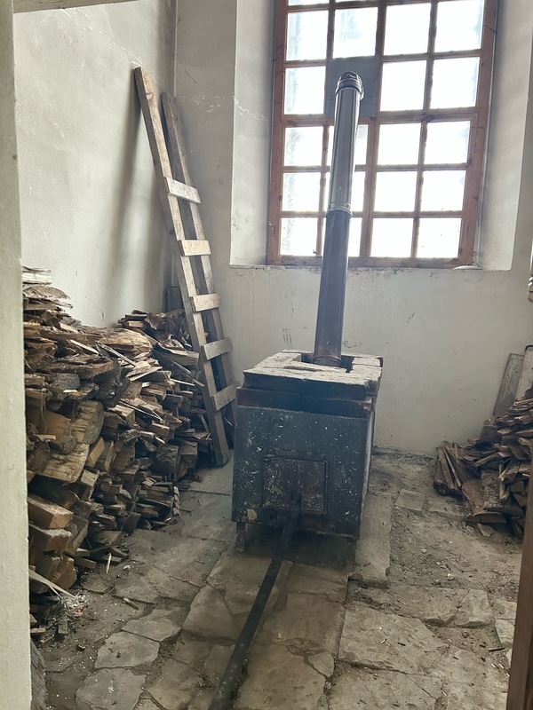 Слева в приделе - дверь в небольшое помещение с железной печкой. Ее установили рабочие, чтобы отапливать пространство и во время работ, и для прихожан.