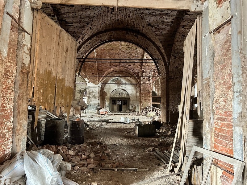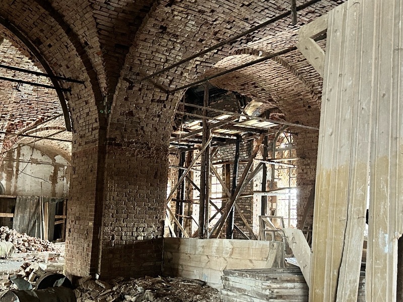 Заглянули и вглубь трапезной. Зайти внутрь мне запретили - небезопасно. Раньше здесь обвалилась кровля, зияла огромная дыра. Сейчас под ней установлены строительные леса.