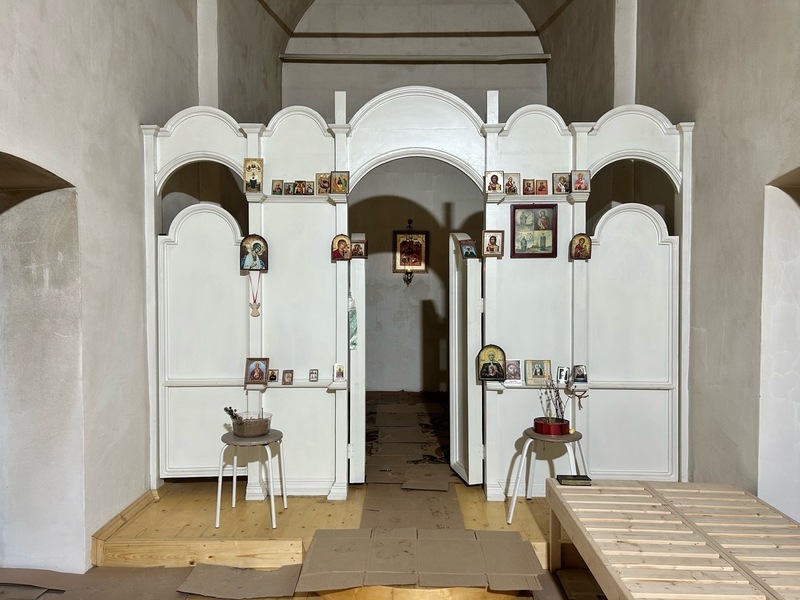 После расчистки меценат оценил ситуацию. Проход к главному алтарю был опасен, и решил временно обустроить молитвенное помещение у входа. Рабочие пристроили деревянное крыльцо, внутри возвели стену из силикатного кирпича, побелили стены, установили иконостас и сколотили скамьи. Так появился придел.