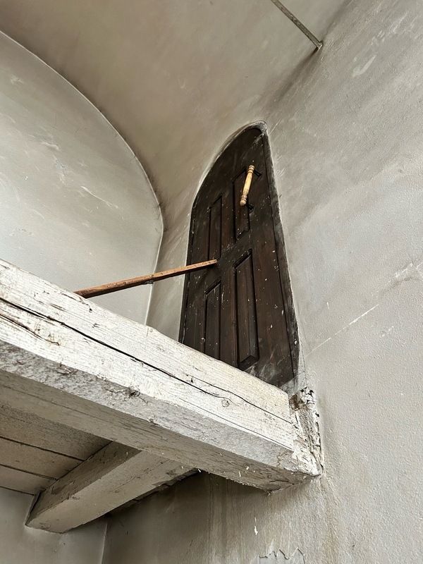 За печью стоит приставная лестница, ведущая на второй ярус колокольни. Но подниматься туда пока опасно: реставрация еще не велась, перекрытия некрепкие.