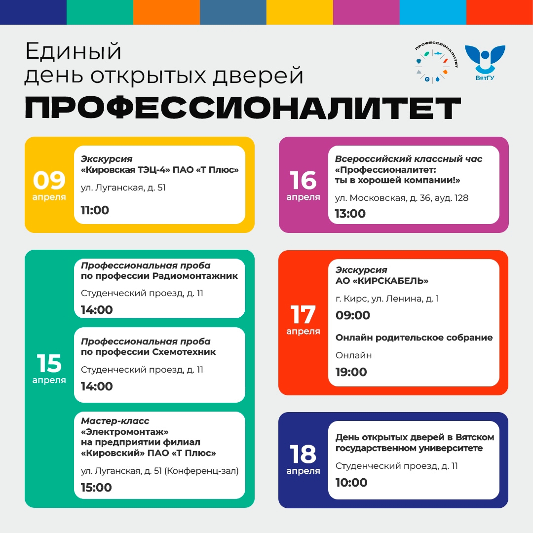 18 апреля, в субботу, в учебном корпусе №8 ВятГУ (г. Киров, Студенческий пр., 11) в 10:00 часов пройдет Единый день открытых дверей федерального проекта «Профессионалитет». Приглашаем школьников с 8 по 11 классы! Ребята, приходите сами и приводите родителей! Вам в подробностях расскажут о перспективах обучения на самых востребованных специальностях, а также покажут много интересного: ведь именно на этой площадке совсем скоро будет создан учебно-производственный центр проекта «Профессионалитет» с 14 зонами по различным видам работ. Приходите – будет очень интересно!