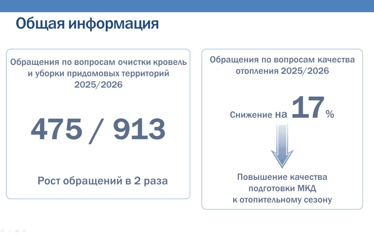 Из-за сложных погодных условий количество обращений по очистке кровель и уборке дворов выросло вдвое — с 475 до 913. При этом жалоб на качество отопления стало на 17% меньше — дома подготовили хорошо. Серьёзных аварий на системах отопления не зафиксировано.