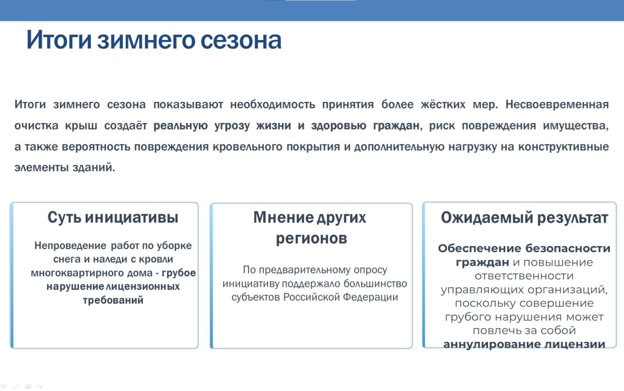 За зимний период Госжилинспекция привлекла управляющие организации к административной ответственности на сумму более 5 миллионов рублей. Но, по словам главы региона, штрафы не всегда действенны. Кировская область выступила с предложением внести изменения в федеральное законодательство: включить в перечень грубых нарушений лицензионных требований несвоевременную очистку кровель от снега и наледи, что повлечёт аннулирование лицензии.