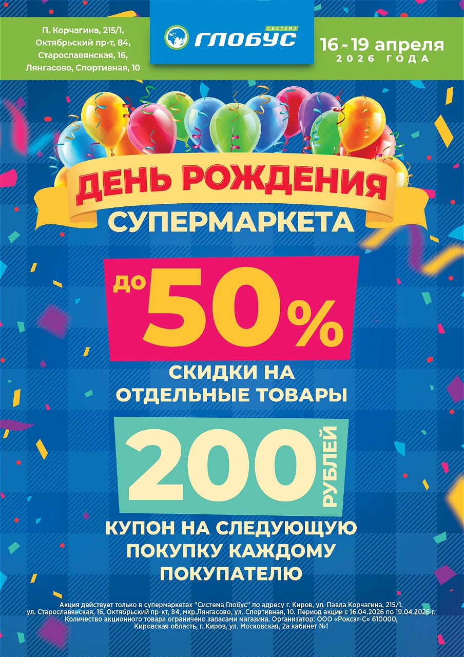 С 16-19 апреля отмечаем день рождения супермаркетов «Система Глобус»