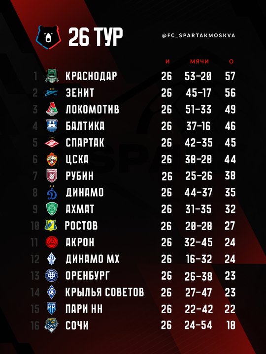 Далее следуют «Локомотив» с 49 очками, «Балтика» – 46 и «Спартак» – 45.